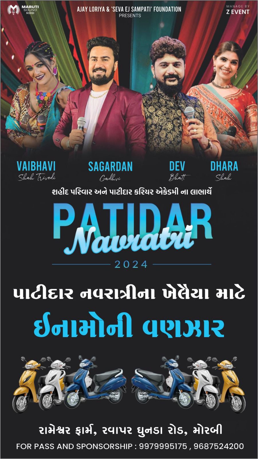 મોરબીમાં દર વર્ષની જેમ આ વર્ષે પણ શહીદ પરીવાર અને પાટીદાર કરિયર એકેડમીના લાભાર્થે પાટીદાર નવરાત્રી મહોત્સવનું રામેશ્વર ફાર્મ, રવાપર – ઘુનડા રોડ પર આયોજન કરવામાં આવ્યું છે જેમાં 9 દિવસ સુધી ગુજરાતના નામી કલાકારો વૈભવી શાહ ત્રિવેદી, સાગરદાન ગઢવી, દેવ ભટ્ટ અને ધારા શાહ ગરબાની રમઝટ બોલાવી ખૈલાયાઓને મન મુકીને ગરબે રમાડશે.