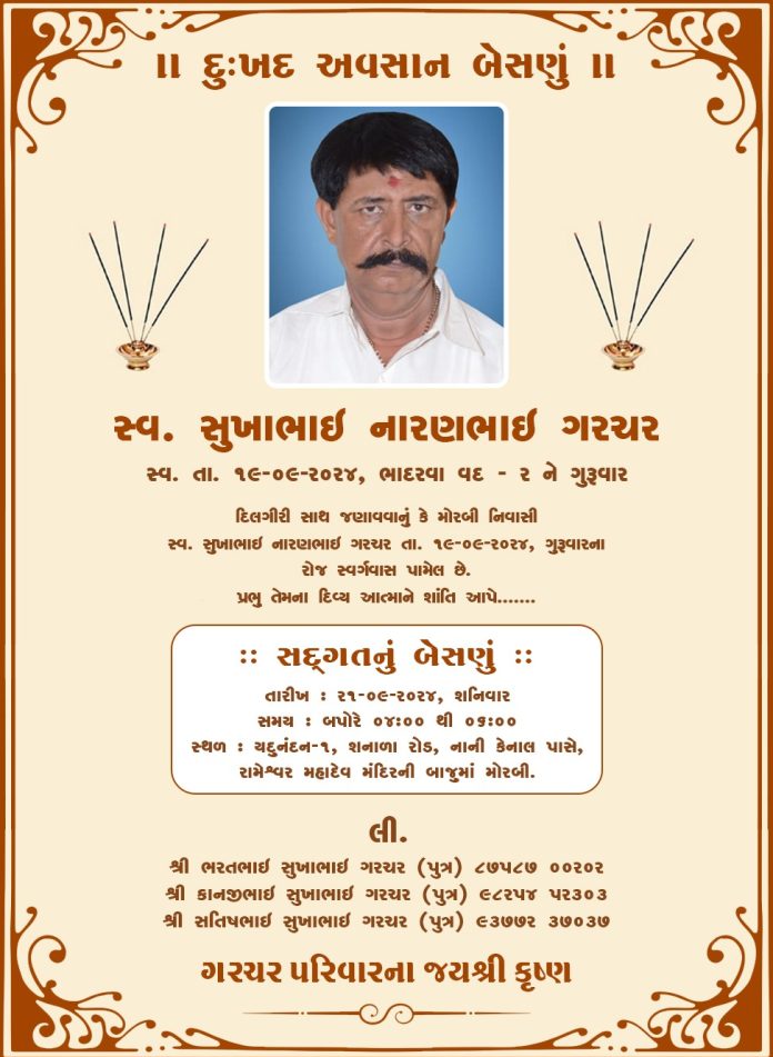 HomeGujaratમોરબી નિવાસી સ્વ. સુખાભાઈ નારણભાઈ ગરચર નું અવસાન, આવતીકાલે બેસણું