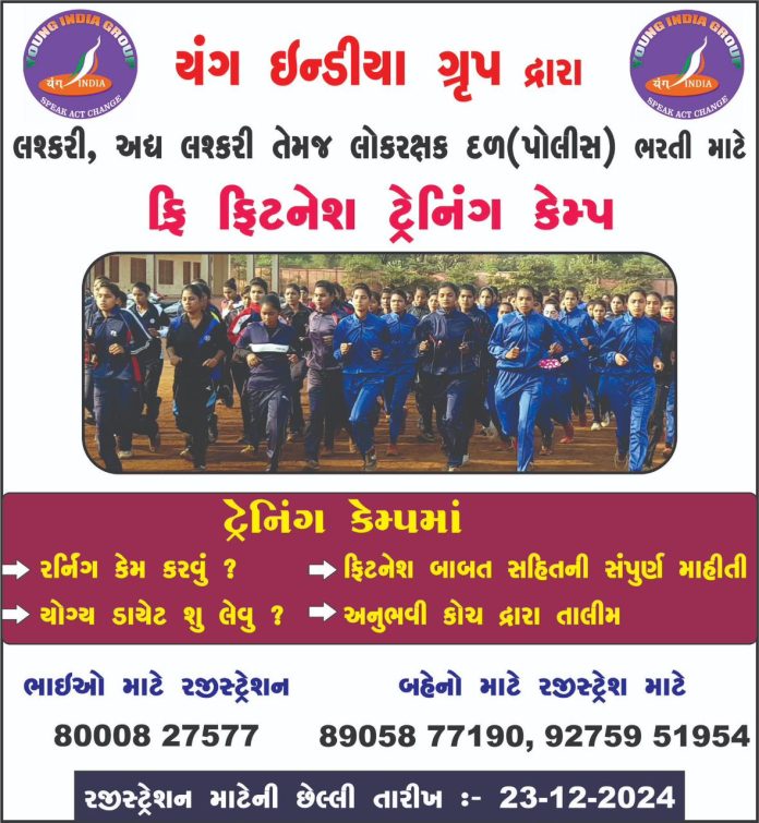 આગામી લશ્કરી, અર્ધ લશ્કરી તેમજ લોકરક્ષક દળ (પોલીસ)ની ભરતી માટે ફ્રિ ફિટનેશ ટ્રેનિંગ કેમ્પ યોજાશે