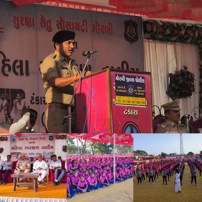 ટંકારા પોલીસ મથકે મહિલા સ્વરક્ષણ તાલિમાથી ટ્રેનિંગ પ્રદર્શન અને પોલીસ મથકની મુલાકાત સાથે પોલીસ પ્રજાના મિત્ર સહિત સુરક્ષા અને સલામતી ટ્રાફિક સહિતના બાબતે માર્ગદર્શન અપાયું હતું. મહિલાઓને સ્વરક્ષણ અને સશક્તિકરણ માટે જુડો, કરાટેની તાલીમ આપવામાં આવી હતી.