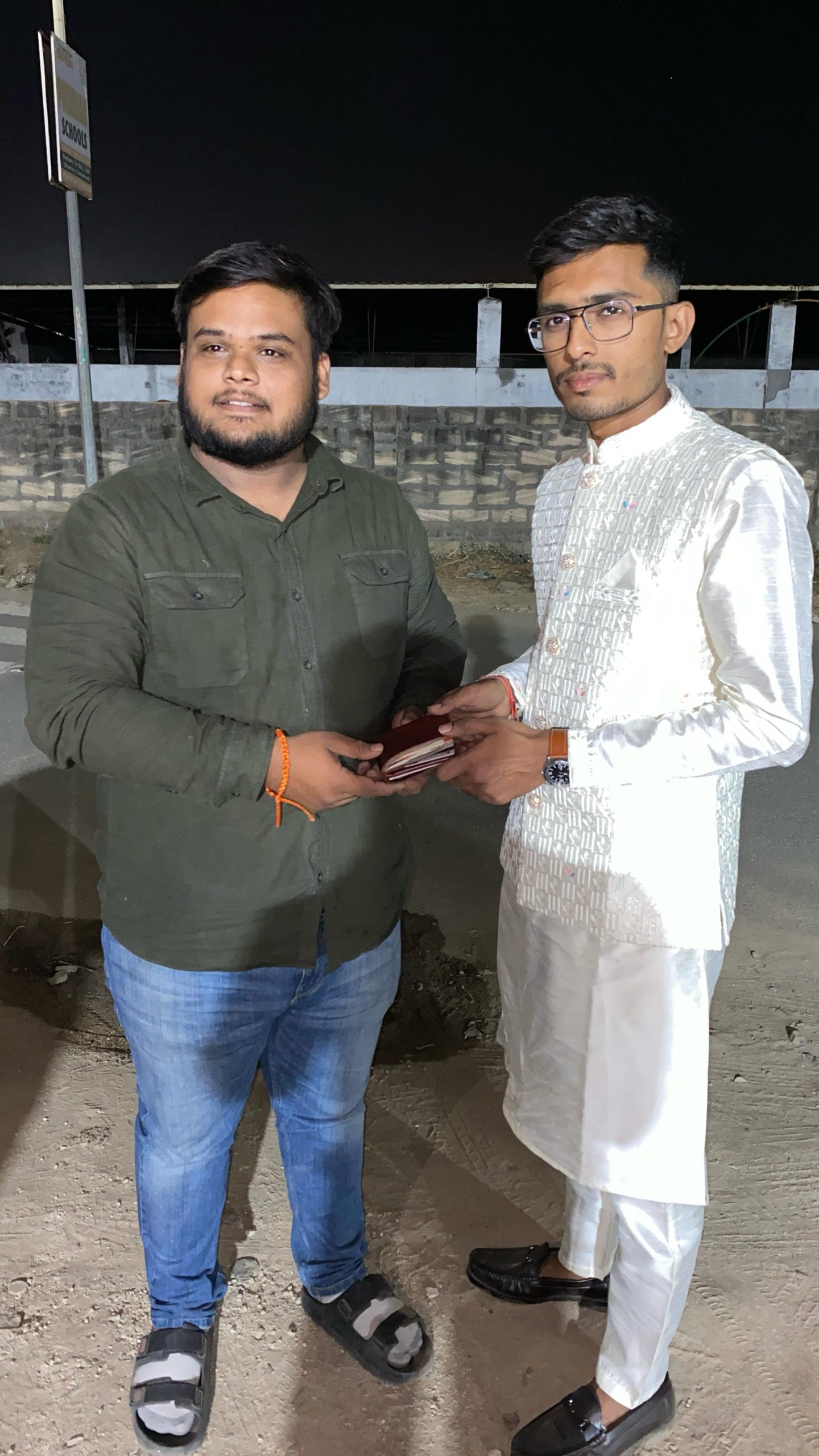 દરમિયાન વાવડીના પેટ્રોલ પંપ નજીકથી પસાર થઇ રહેલા નિર્ભય સંજયભાઈ મહેતાને આ પાકીટ મળતા તેમને પાકીટમાં તપાસ કરતા પાકીટના માલિકના અગત્યના ડોક્યુમેન્ટ્સ જોવા મળ્યા હતા. આ તકે પાકીટમાના પૈસા બાબતે કોઈ પણ લોભનો વિચાર મનમાં લાવ્યા વગર નિર્ભયે પાકીટના મૂળ માલિક દેવભાઈ સુધી પહોંચવાની જહેમત ઉઠાવતા પાકીટના માલિકનો ભેટો થઇ ગયો હતો. દરમિયાન પાકીટમાં રહેલા અગત્યના ડોક્યુમેન્ટસનાં આધારે ખરાઈ કરતા આ પાકીટ દેવ કવૈયાનું જ હોવાનું સાબિત થઇ ગયું હતું. પ્રસ્તુત તસ્વીરમાં સી.એ.નો અભ્યાસ કરતા નિર્ભય સંજયભાઈ મહેતા(બ્લુ જીન્સ) મૂળ વ્યક્તિને પાકીટ પરત સોંપી ને પ્રામાણિકતાનું પ્રેરક ઉદાહરણ પૂરું પાડતા દેખાય છે.