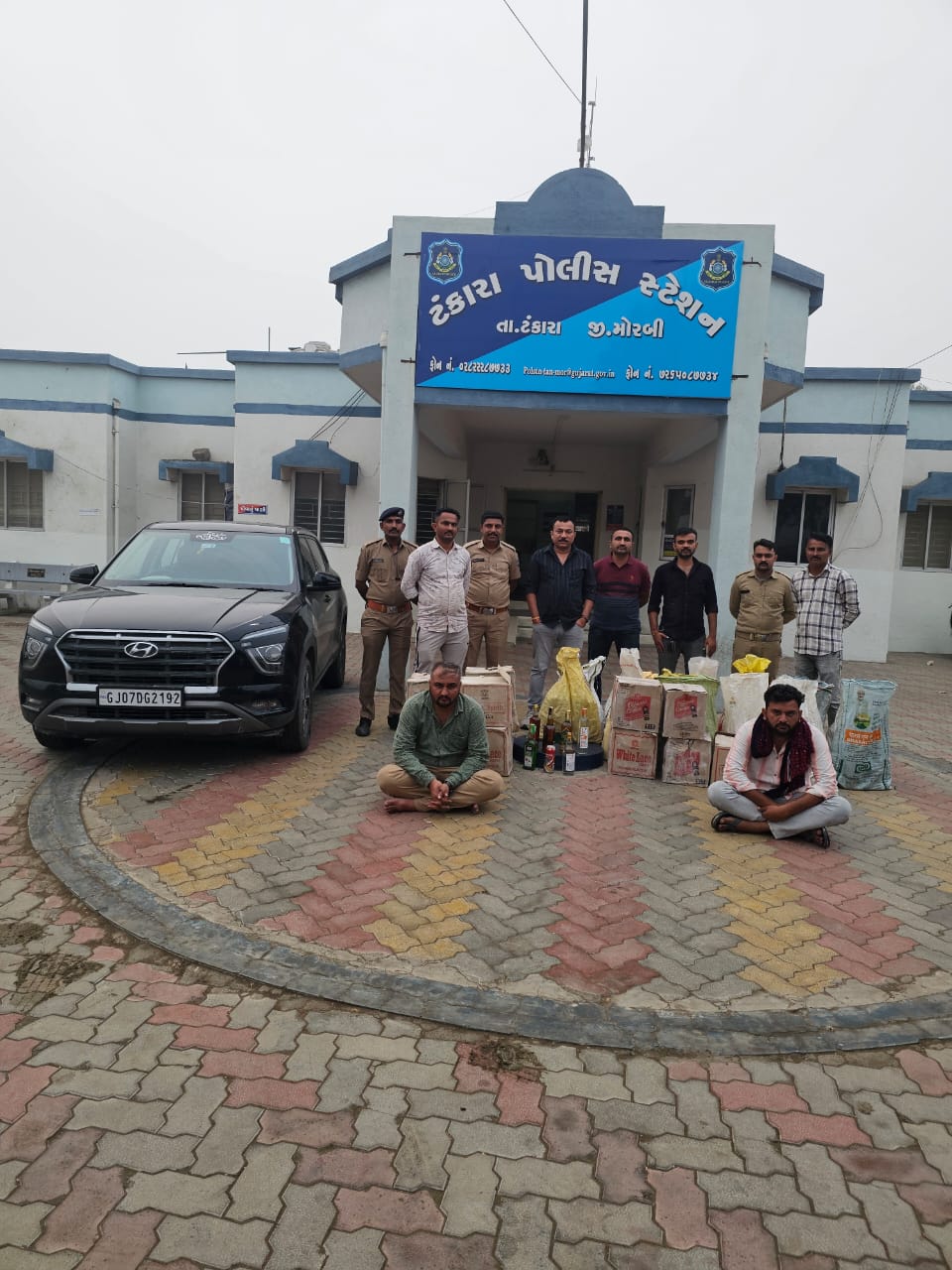 મળતી વિગતો મુજબ ટંકારા પોલીસ ટીમ પેટ્રોલિંગમાં હોય દરમિયાન બાતમી મળી હતી કે કાળા કલરની ક્રેટા કાર નેકનામ જોધપર ગામ તરફથી આવવાની છે જે કારમાં દારૂ અને બીયરનો જથ્થો ભરેલ છે જેથી ટીમે વોચ ગોઠવી હતી અને કારને રોકી તલાશી લેતા અલગ અલગ બ્રાન્ડની દારૂની બોટલ નંગ 318 કીમત રૂ.1,24,362 અને બીયર નંગ 48 કીમત રૂ.5,562 મળી આવતા દારૂ-બીયર અને કાર તેમજ 2 મોબાઈલ સહીત કુલ રૂ.7,39,930નો મુદામાલ કબજે લીધો હતો. તેમજ કારમાં સવાર આરોપીઓ ઉદયસિંહ સહદેવસિંહ ઝાલા (રહે. મેઘપર ઝાલા તા.ટંકારા) અને કુલદીપસિંહ પ્રવીણસિંહ ઝાલા રહે જોધપર ઝાલા તા. ટંકારા એમ બે ઇસમોને ઝડપી લીધા છે અન્ય આરોપી યોગીરાજસિંહ ગીરીરાજસિંહ જાડેજા (રહે.અગાભી પીપળીયા તા. વાંકાનેર) વાળાનું નામ ખુલતા પોલીસે વધુ તપાસ ચલાવી છે.