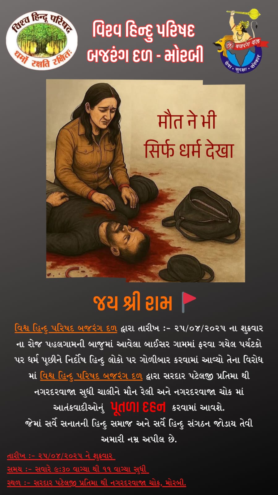 કાશ્મીરમાં ફરવા ગયેલા લોકોને ૨૨ એપ્રિલના રોજ પહલગામની બાજુમાં બાઈસરનમાં ઇસ્લામિક જેહાદી માનસિકતા વાળા આતંકવાદીઓ એ તેમનો ધર્મ પૂછી, કલમાં વાંચવાનું કહી, લોકોના પેન્ટ ઉતારીને ધર્મ ચેક કરવામાં આવ્યો અને પછી હિન્દુ છે એવી આતંકવાદીને ખબર પડતા જ મોતને ઘાટ ઉતારી દેવામાં આવ્યા. આ ઘટનાને સમગ્ર દેશમાં ચકચાર મચાવી દીધી છે, જેના વિરોધમાં વિશ્વ હિન્દુ પરિષદ – બજરંગ દળ સખ્ત શબ્દોમાં નિંદા કરે છે અને એ આતંકવાદીઓના વિરોધમાં સવારે ૯:૩૦ કલાકે સરદાર વલ્લભભાઈ પટેલની પ્રતિમા પાસેથી ચાલ નગરદરવાજા સુધી મૌન રેલી યોજી આવતીકાલે શુક્રવારના રોજ 11 વાગ્યે નગરદરવાજાના ચોકમાં આતંકવાદીના પૂતળા દહનનો કાર્યક્રમ રાખવામાં આવ્યો છે.