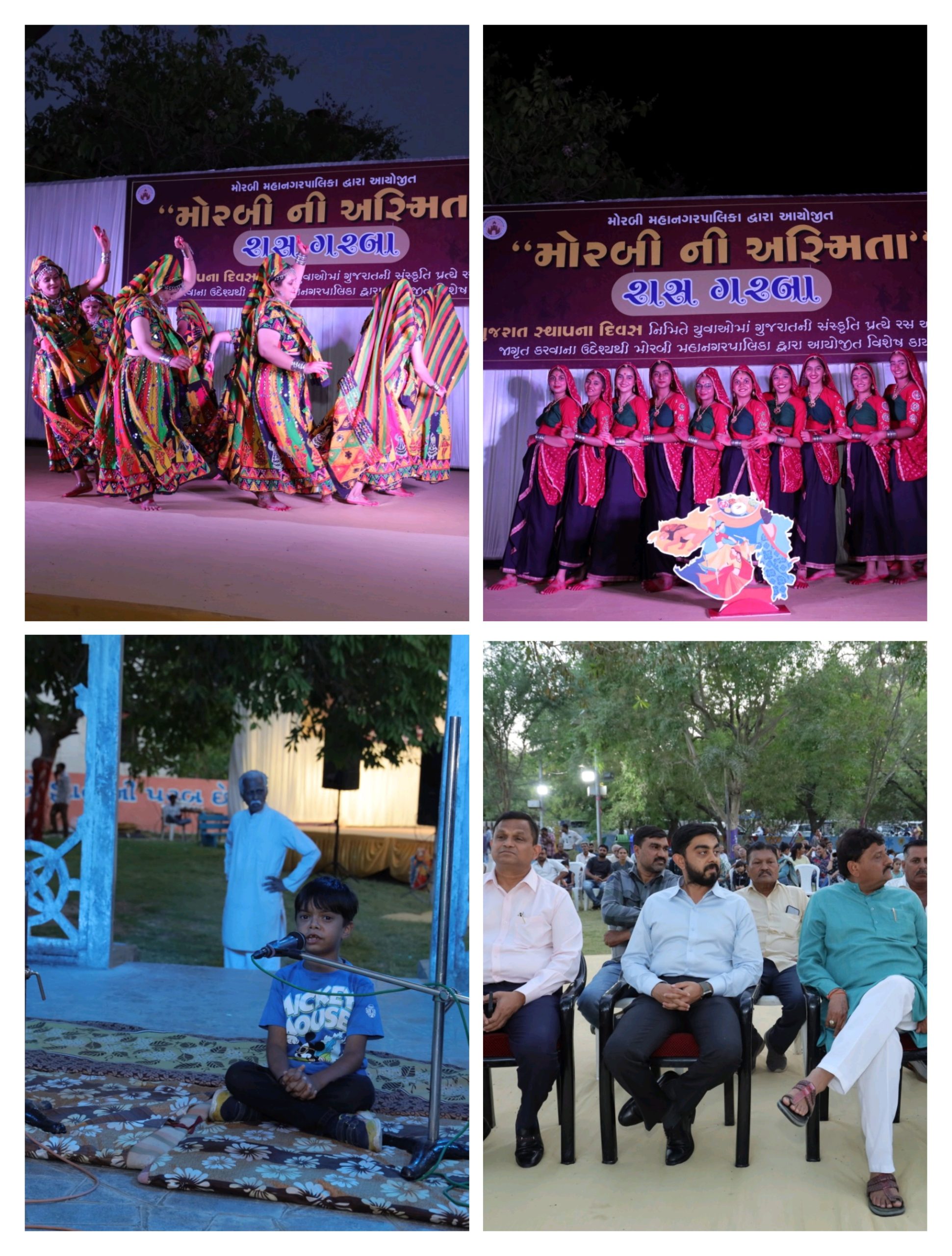 મોરબી મહાનગરપાલિકા દ્વારા ગઈકાલે ગુજરાત સ્થાપના દિવસે યુવાનોમાં ગુજરાતની સંસ્કૃતિ પ્રત્યે રસ અને ગૌરવ જાગૃત કરવાના ઉદેશ્યથી મોરબી મહાનગરપાલિકા દ્વારા એક વિશેષ કાર્યક્રમ ‘મોરબીની અસ્મિતા”નું આયોજન કરવામાં આવ્યું હતું. જેમાં રાસ ગરબા, એક પાત્રીય અભિનય, સોલો ડાન્સ, ગાયન તેમજ વાદન જેવી વિવિધ પ્રવૃત્તિઓ કરવામાં આવી હતી. જેમાં કુલ ૬૮ સ્પર્ધકો દ્વારા ભાગ લેવામાં આવ્યો હતો તથા બહોળી સંખ્યામાં નગરજનોની ઉપસ્થિતિએ આ કાર્યક્રમની શોભા અનેકગણી વધારી દીધી હતી.
