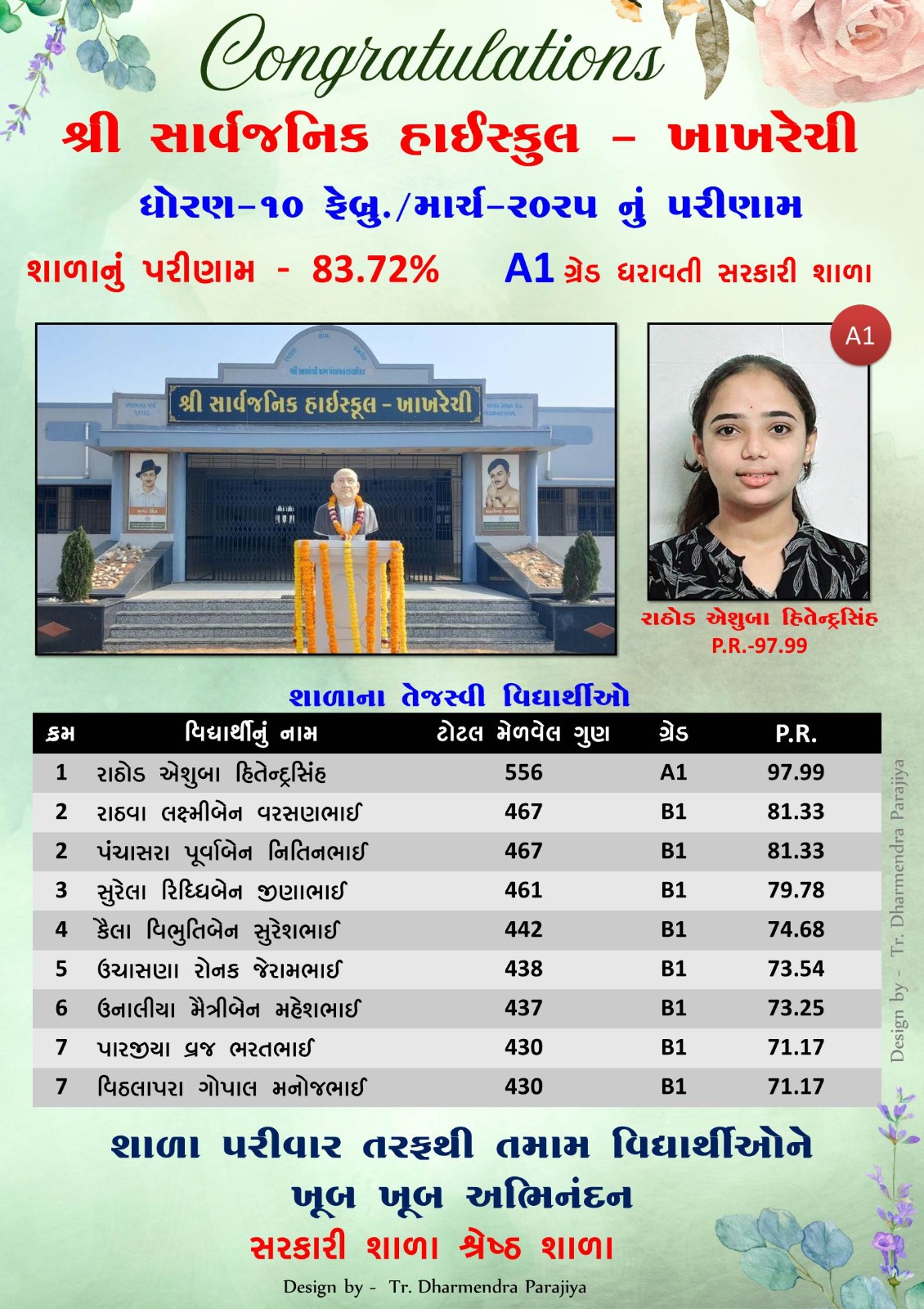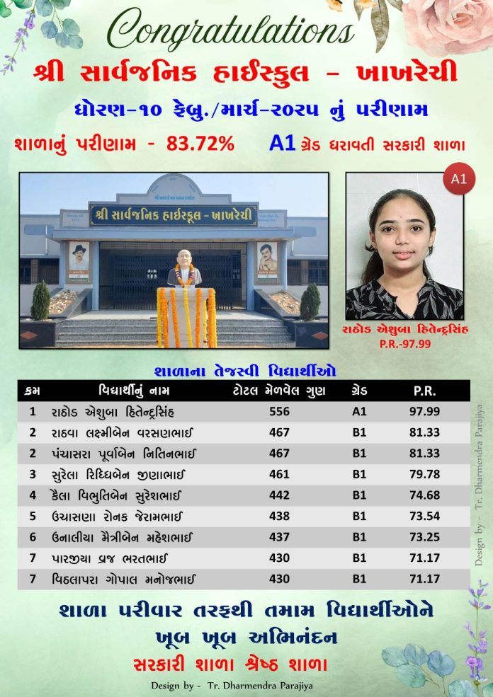 ધોરણ – 10 ની ફેબ્રુઆરીમાં લેવાયેલી બોર્ડની પરીક્ષામાં માળીયા તાલુકાના ખાખરેચીની સાર્વજનિક હાઈસ્કૂલે 83.72 % સાથે ઉત્કૃષ્ટ પરિણામ મેળવ્યું છે.