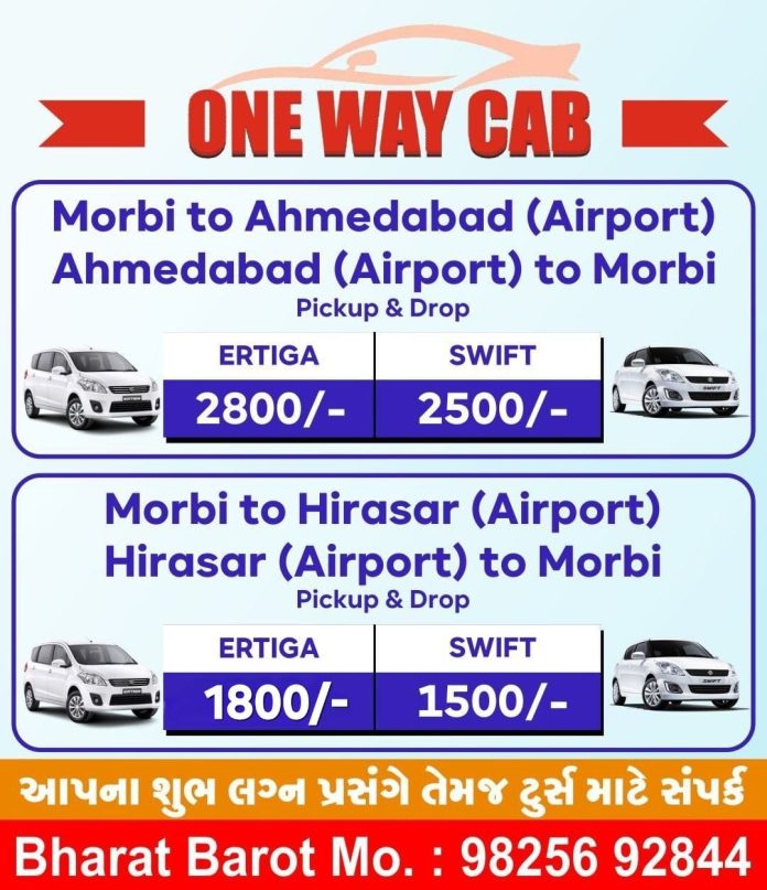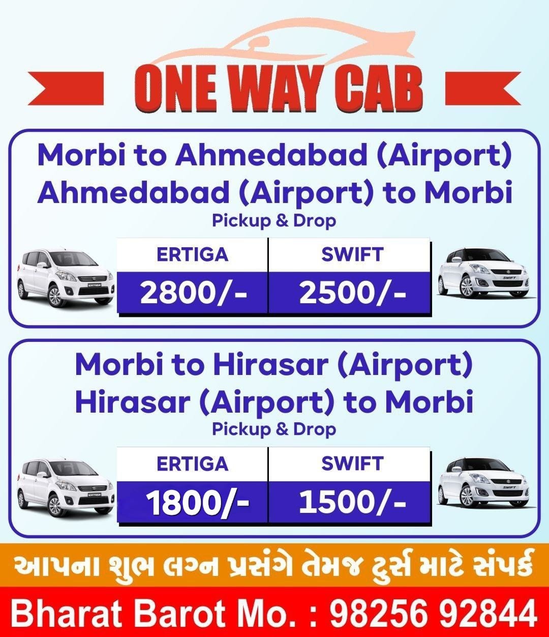 One way cab ની કાર ફ્રી આપવાની જાહેરાત કરવામાં આવી છે. ઓન વે કેબ માટે સંપર્ક કરો ભરત બારોટ નં. 9825692844 માં.