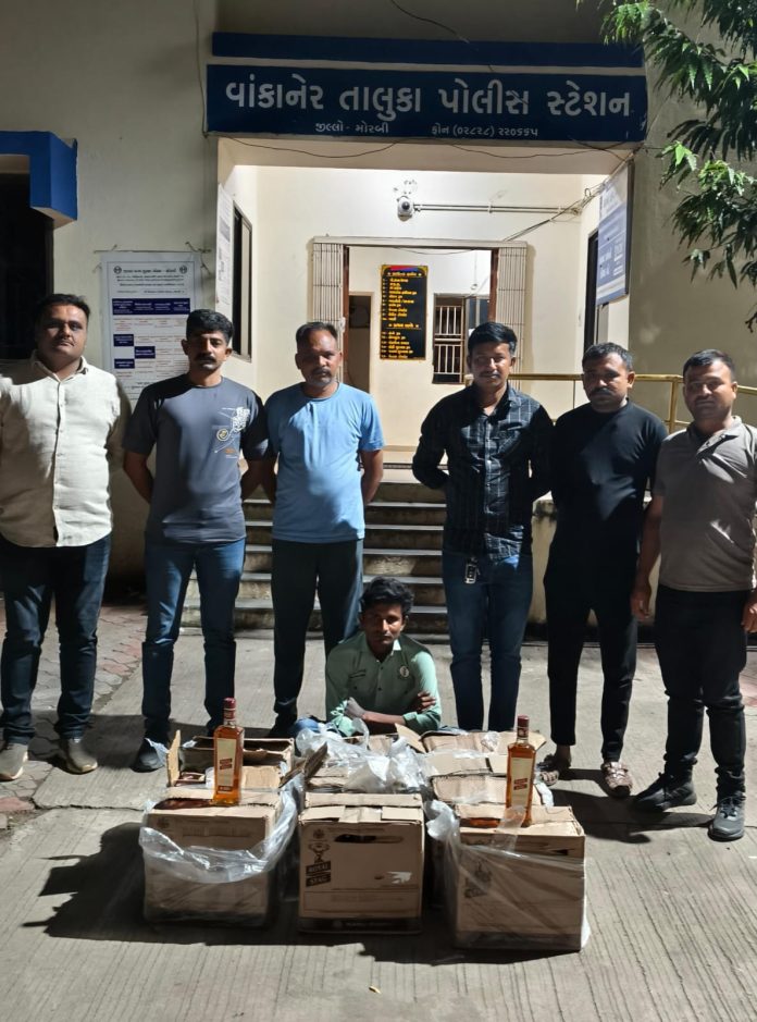 પોલીસ ઈન્સપેક્ટર બી.વી. પટેલની સૂચનાએ સર્વેલન્સ સ્ટાફે બાતમી આધારે પેટ્રોલિંગ દરમિયાન અલ્ટો K-10 કાર (નં. GJ-24-K-4395) અટકાવી તપાસ કરતા કારમાંથી ભારતીય બનાવટની વિદેશી દારૂની ૨૨૦ બોટલો મળી આવી હતી. પકડાયેલ આરોપી રાહુલભાઈ ગોપાલભાઈ ચુડાસમા (રહે. ધર્મનગર, મોરબી) તેમજ ફરાર આરોપી કાળુભાઈ અબ્રાહમભાઈ સુમરા (રહે. લાખચોકીયા, તા. ચોટીલા, જી. સુરેન્દ્રનગર) નો સમાવેશ થાય છે.