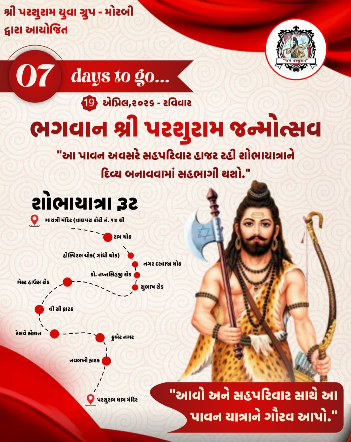 આગામી તારીખ ૧૯ એપ્રિલ ૨૦૨૬ ના રોજ ભગવાન શ્રી પરશુરામ જન્મોત્સવ નિમિત્તે શ્રી પરશુરામ યુવા ગ્રુપ મોરબી દ્વારા બપોરે ૦૩:૦૦ વાગ્યે ગાયત્રી મંદિર વાઘપરા થી ભવ્ય શોભાયાત્રાનું આયોજન કરેલું છે .જે મોરબીના રાજમાર્ગો પર ફરી ને સાંજે ૦૭:૩૦ એ શ્રી પરશુરામ ધામ પહોચશે અને ત્યાં સાંજે ૦૭:૩૦ એ મહા આરતી અને અન્નકૂટ અને ત્યારબાદ મહા પ્રસાદનું આયોજન છે તો મોરબી ના તમામ ભુદેવને સહપરિવાર સાથે પધારવા ભાવ ભર્યું આમંત્રણ પાઠવવામાં આવ્યું છે.